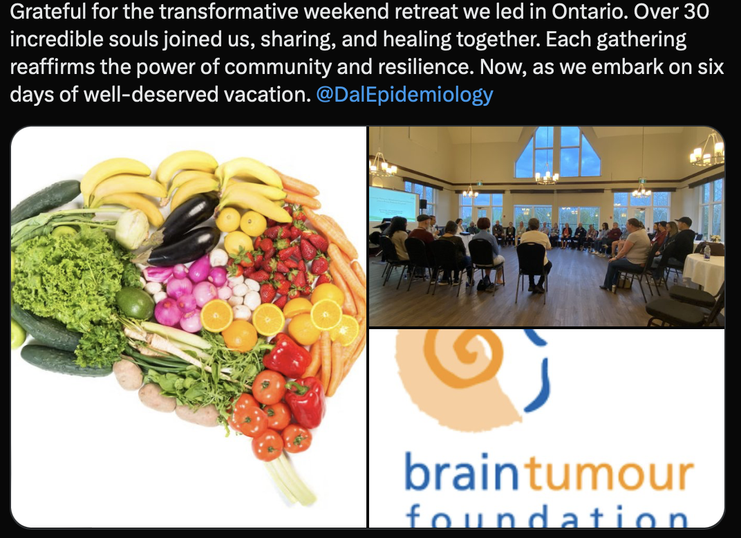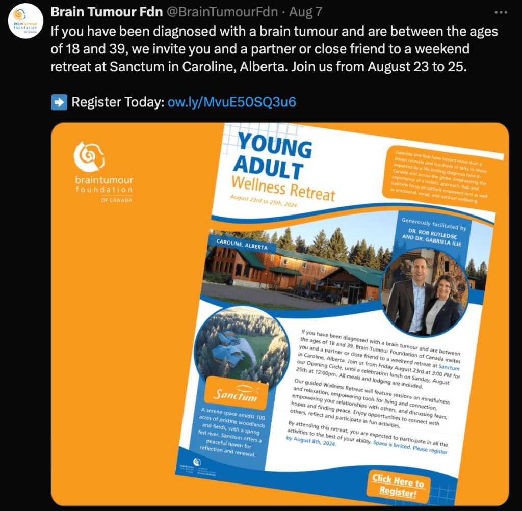 September 22, 2023: Brain Tumour Foundation of Canada: A few weeks ago, young adults from our brain tumour community attended a wellness retreat at the Five Oaks Center in Paris, ON. We would like to thank Dr. Rutledge & Dr. Ilie from @CancerPEPcom for facilitating the event. Thank you to all the amazing #YoungAdults who attended!