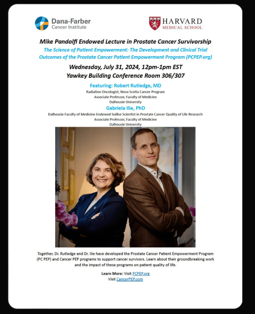 Dr. Gabriela Ilie & Dr. Rob RutledgeDr. Gabriela Ilie and Dr. Rob Rutledge are co-creators of the Prostate Cancer Patient Empowerment Program (PC-PEP) and CancerPEP, groundbreaking initiatives that empower cancer patients to take an active role in their recovery and long-term well-being. These programs are unmatched in their depth, breadth and scientific validation, combining structured online education with interactive engagement to support patients through every stage of their cancer journey.What makes PC-PEP and CancerPEP unique is their six-month intensive curriculum followed by ongoing monthly live video conferences. This structure provides cancer patients with continuous access to expert guidance, peer support, and evidence-based strategies to enhance mental, emotional, and physical health. Research has demonstrated that patients in these programs experience reduced psychological distress, improved resilience, better management of treatment side effects, and an overall higher quality of life (and appear to be cost saving to the medical system). These programs are now actively implemented in healthcare systems across Canada and internationally, with adoption in New Zealand, Belgium, South Africa, Romania, and the Netherlands.